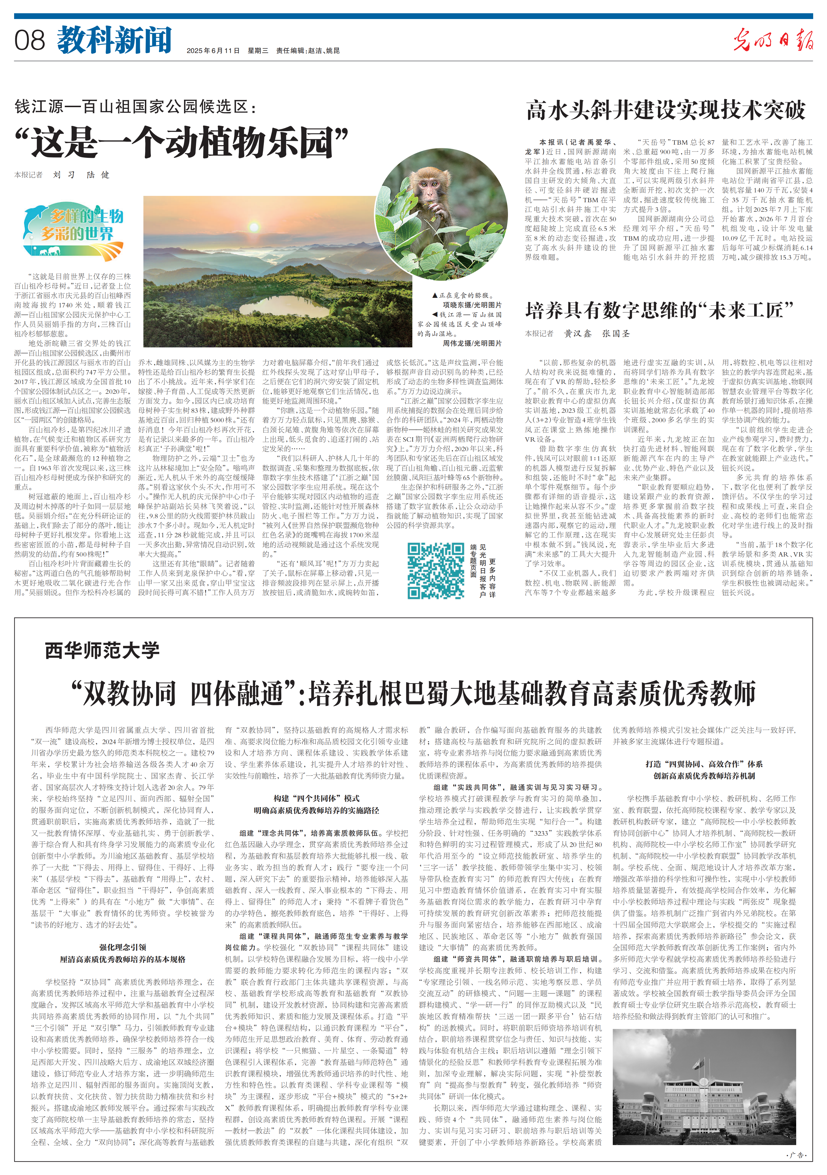 “我们以科研人、护林人几十年的数据调查、采集和整理为数据底板,依靠数字孪生技术搭建了‘江浙之巅’国家公园数字孪生应用系统。现在这个平台能够实现对园区内动植物的巡查管控、实时监测,还能针对性开展森林防火、电子围栏等工作。”方万力说,“被列入《世界自然保护联盟濒危物种红色名录》的斑嘴鸭在海拔1700米湿地的活动视频就是通过这个系统发现的。”